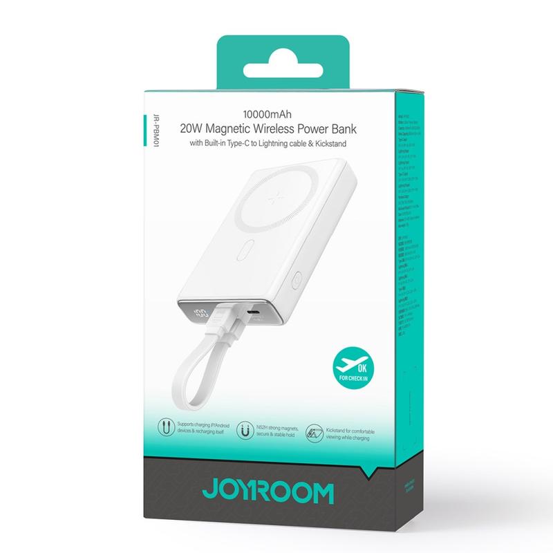 JOYROOM JR-PBM01 PD 20W 10000mAh Phone Power Bank Magnetic Wireless Charger with Built-in Cable / Kickstand - White