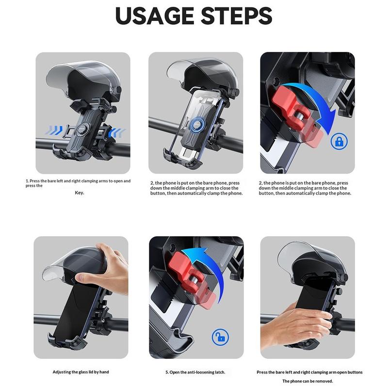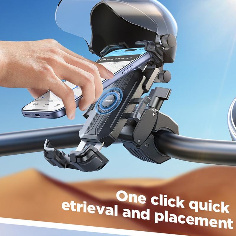 Ride with better visibility and safer access to navigation with the JOYROOM JR-ZS526 phone holder mount. Built for electric bicycles, bicycles and motorcycles, it features a 270 degree adjustable sunshade that helps block glare and reflections so your screen stays readable in bright daylight. A sturdy locking mechanism and metal clamp arms keep your phone stable on rough roads, while the quick-release button lets you mount or remove your device with one hand in seconds.