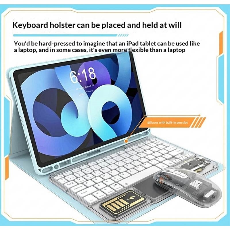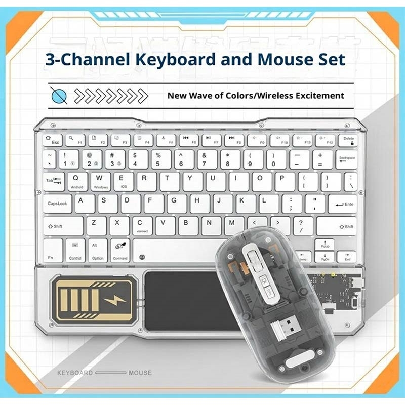 Upgrade your desk or tablet setup with the KB333 transparent Bluetooth keyboard and mouse set. Designed for work, study, and everyday use, this wireless combo combines a compact keyboard, built-in touchpad, and matching mouse in one stylish setup. The transparent design with RGB backlighting gives it a modern look, while 3-channel connectivity makes it easy to switch between multiple devices.
