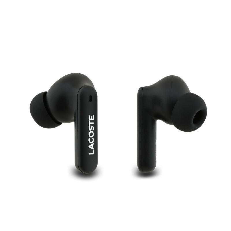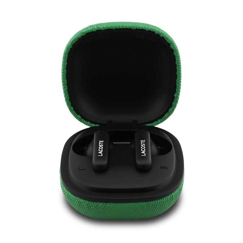 - Compact charging case with Lacoste branding