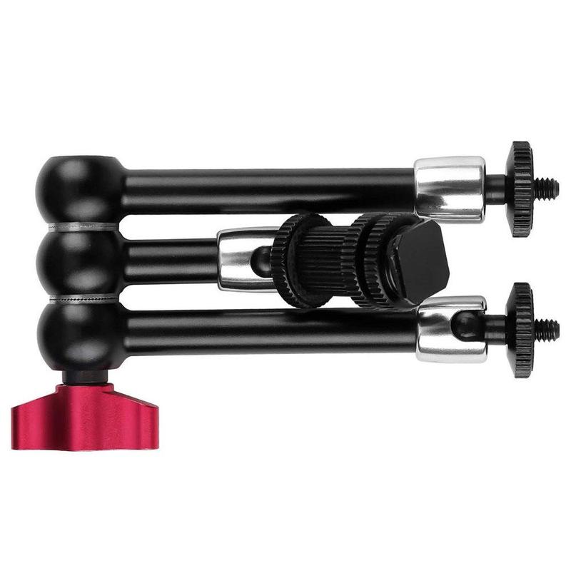 Made from aluminum alloy and stainless steel, the mount offers a strong and durable structure with a metal gear mesh design for more secure positioning. The 360 adjustment on all joints makes it easier to fine-tune angles, while the hot shoe and 1/4" mounting support gives it broad compatibility with DSLR cameras and related accessories. Red quick-lock handles allow fast setup and repositioning without tools, helping streamline your workflow during shooting.