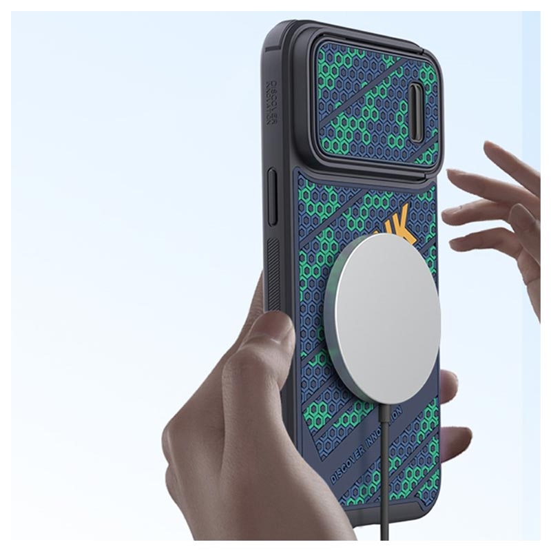 This dual-layer case with a unique 3D honeycomb design is made of flexible, shock-absorbing TPU material and hard plastic, with a built-in magnetic sheet compatible with Apple MagSafe accessories. Upon that, the case features a camera slider that fully protects the camera on your iPhone 14 Pro.