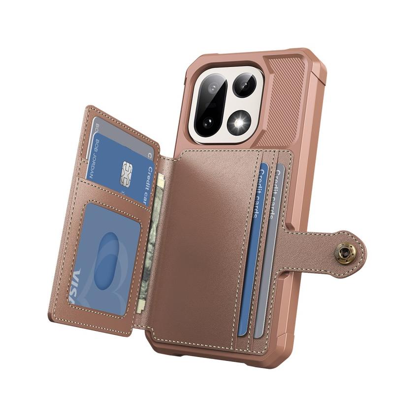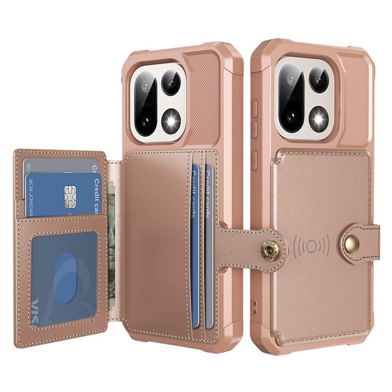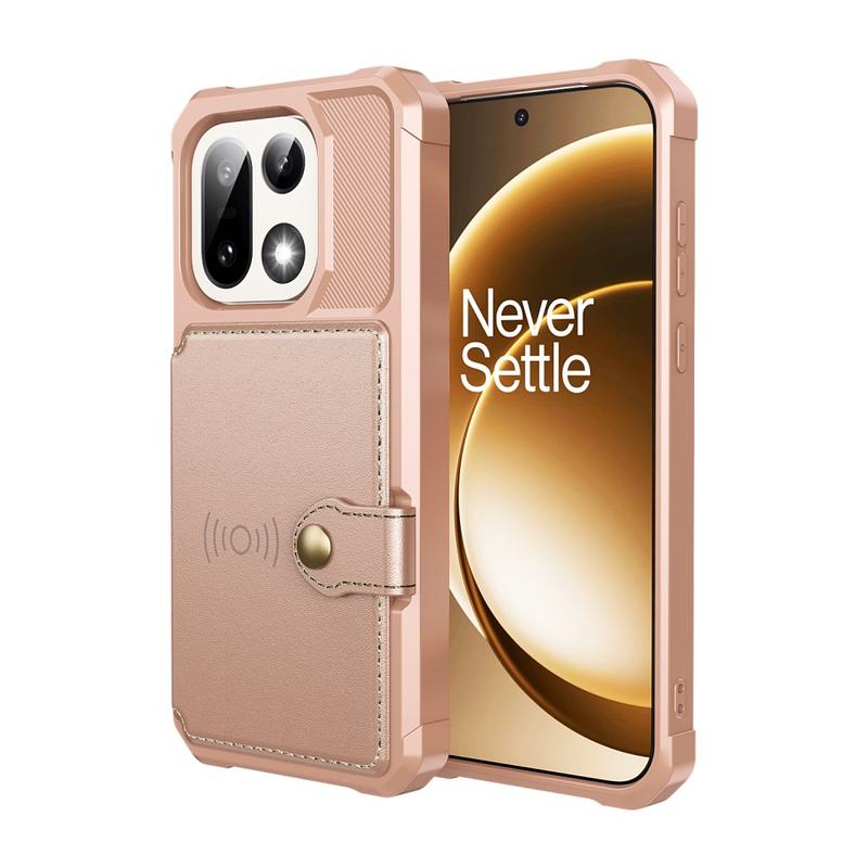 - OnePlus 15 wallet case has a secure snap button closure, wallet design, and several card slots with cash pocket