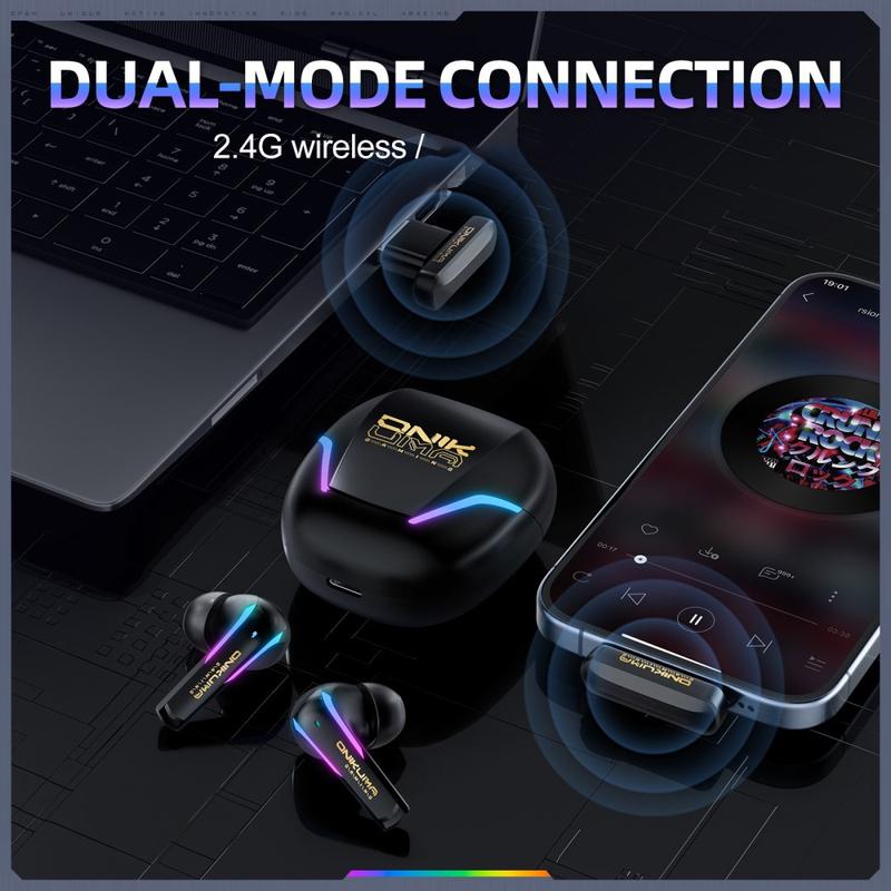 Level up your gaming and everyday listening with the ONIKUMA T27 true wireless earphones. Designed for players who want faster response and flexible connectivity, they support both 2.4G wireless and Bluetooth 5.3, giving you a low-latency setup for gaming and a convenient wireless option for music, calls, and daily use. The ergonomic shape is made for longer sessions, helping the earbuds stay comfortable whether you are gaming at home, commuting, or working out.