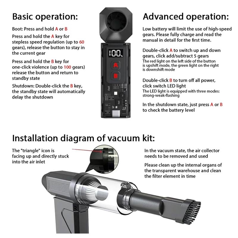 The 2-in-1 Jet Turbo Blower and Vacuum Cleaner is a compact, high-speed cleaning tool designed for fast dust removal and everyday cleanup. Switch between powerful air blasting and vacuum suction to handle different tasks around your home, car, or workspace. With 100 speed levels and a large 8000 mAh battery, you can fine-tune the airflow or suction and keep going for long sessions when needed.