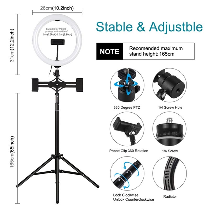 LED ring light can be mounted on the holder and take it anywhere, it can also be removed from the stand at any time, the tripod ball head can 360 degree rotating can free to adjust to any angle