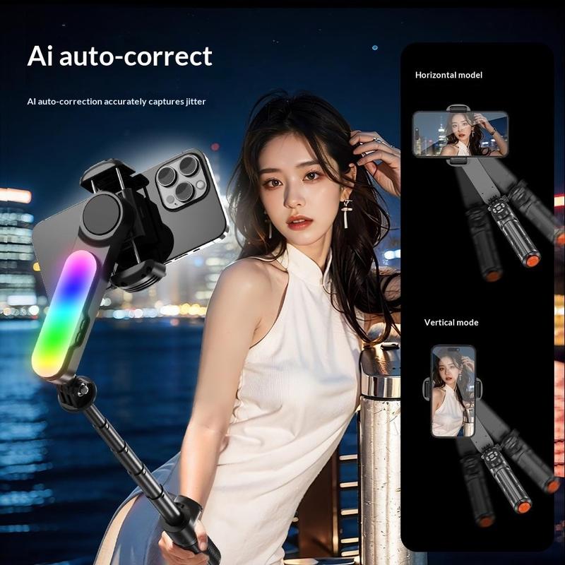 Create more stable and flexible phone content with the Q34 AI anti-shake selfie stick gimbal stabilizer. Designed for live streaming, selfies, video recording, video calls, and everyday content creation, this compact accessory combines a single-axis stabilizer, extendable selfie stick, tripod base, RGB fill light, and wireless remote control in one portable design. With an extension range from 16.8cm to 71cm, it gives you more freedom to adjust framing and shooting distance to suit different scenes.