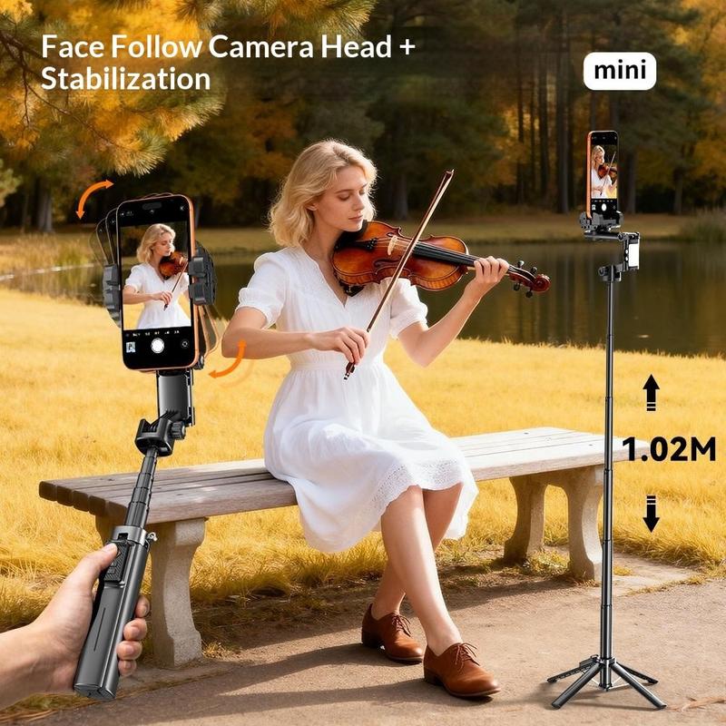 Create smoother and more flexible content with the Q37 AI gimbal stabilizer selfie stick. Designed for live streaming, selfies, video recording, video calls, and everyday content creation, this all-in-one accessory combines AI face tracking, extendable reach, tripod support, stabilisation, RGB lighting, and wireless remote control in one compact design. Its aluminium alloy pole extends from 18.3cm to 1.02m, giving you more freedom to adjust framing, shooting distance, and angle for different scenes.