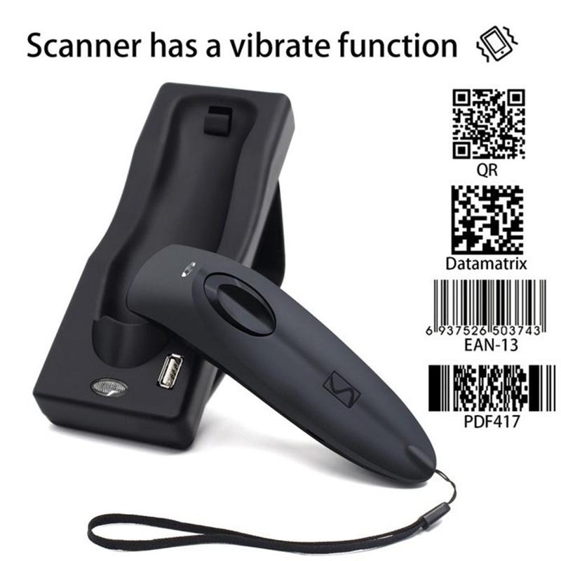 The 1000mAh battery provides up to 20 hours of continuous use, while the included charging base supports both handheld and fixed-position scanning.
