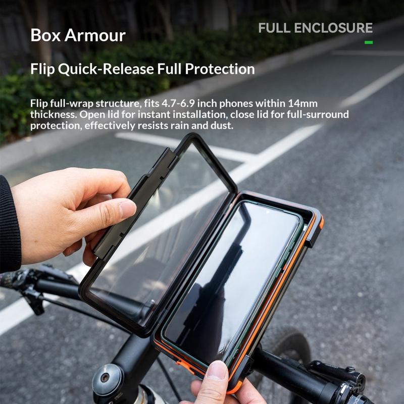 Ride with your phone protected and easy to view using the ROCKBROS waterproof magnetic handlebar phone mount. Built for bikes and e-bikes, it combines a flip-cover sealing design with IPX4 water resistance to help protect your phone from rain and road splashes. A strong magnetic module and non-slip silicone pad provide quick snap-on mounting and stable hold, while the ball-joint design lets you rotate the screen 360 degrees for the best viewing angle. Dedicated openings allow charging and camera use while riding.