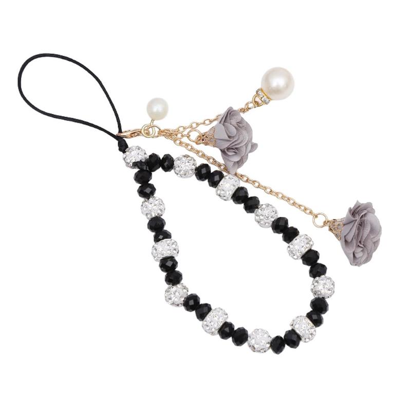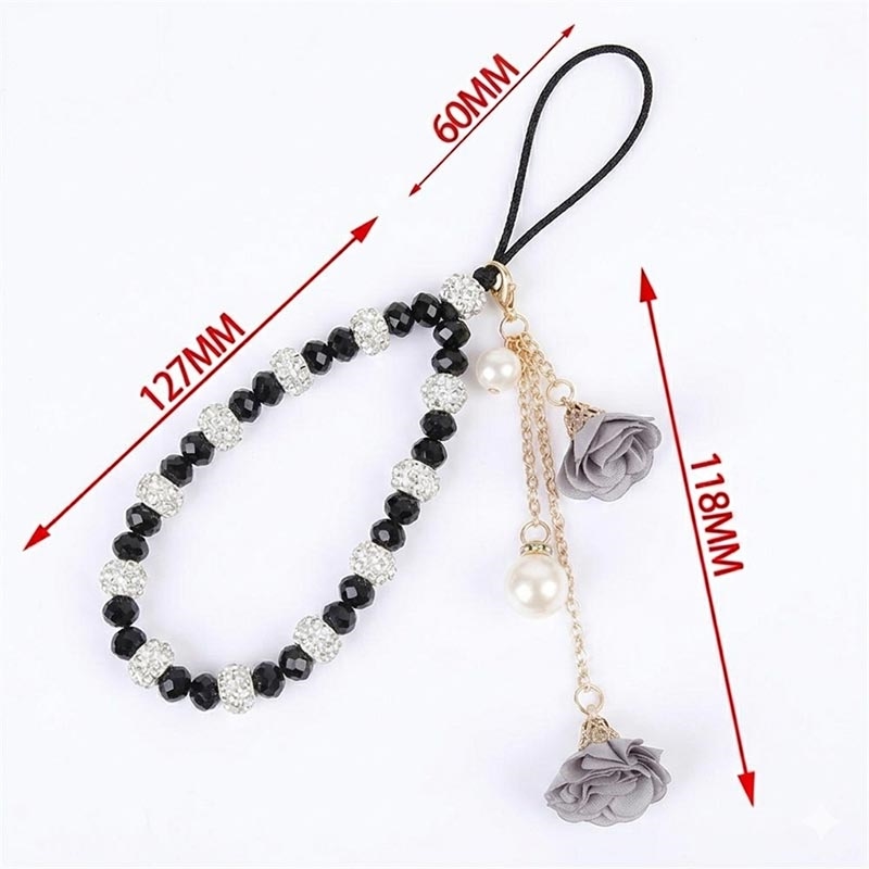 18.7cm Crystal Bead Phone Lanyard with Rose Flower Charms - Wrist Strap Hand Chain Mobile Accessory