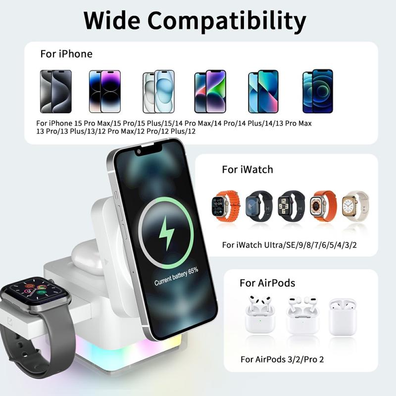 Magnetic alignment helps keep compatible devices in the right position for stable charging, while the foldable design makes the dock easy to pack into a bag or backpack. It also features RGB ambient lighting that adds a soft decorative glow and can work as a gentle night light on a desk or bedside table.