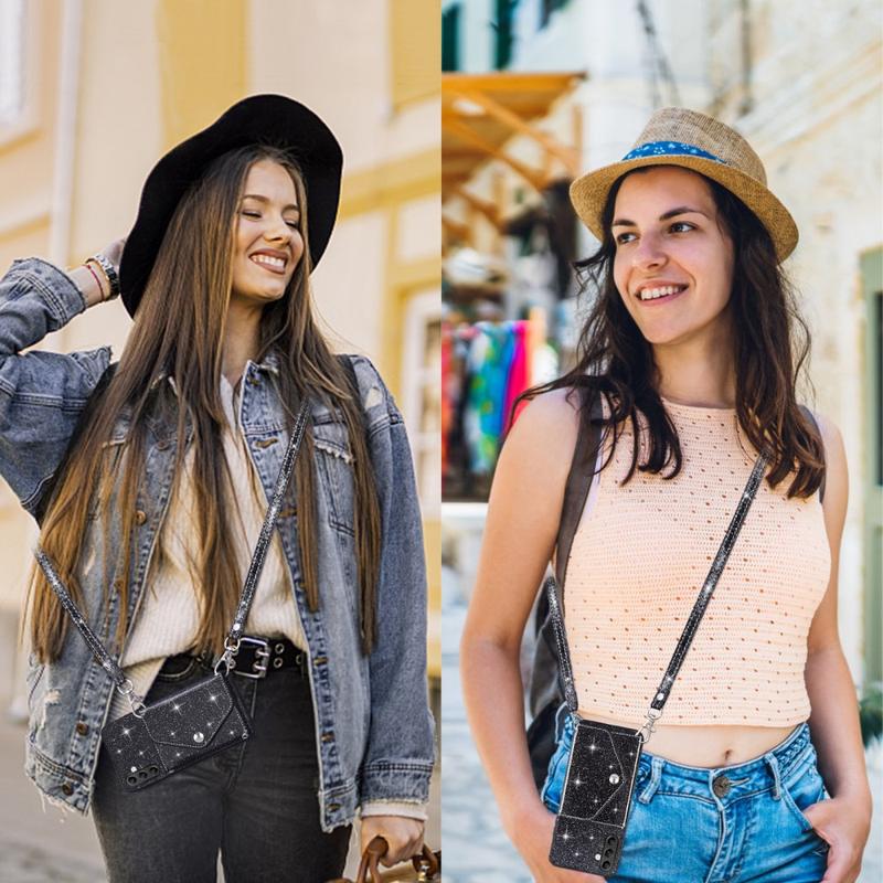 The premium quality case from the Stardust series is the right choice for protecting your Samsung Galaxy A56 from any potential damage. It has a card holder on the back with a snap button which is great to store your essential cards and keep them safe. A shiny glitter surface adds a touch of glamour to your phone. In addition, the cover comes with a 150cm shoulder strap, allowing you to carry your Samsung Galaxy A56 with you wherever you go.