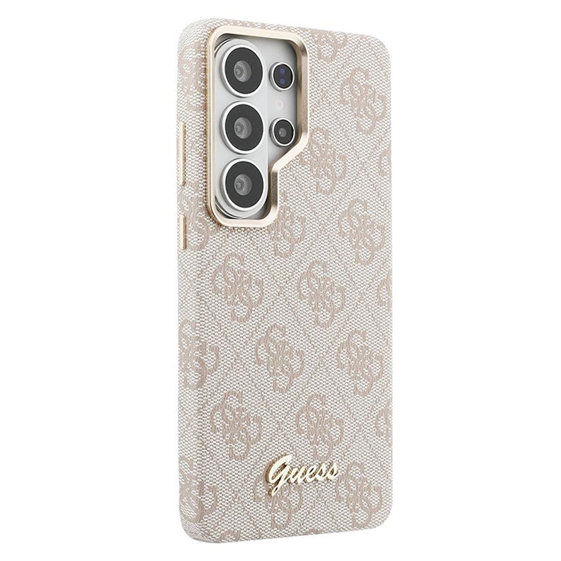 Give your Samsung Galaxy S26 Ultra a premium fashion look with the Guess PU 4G Script Metal Logo Magnetic Case. The signature 4G pattern and gold-tone Guess metal logo create an elegant, high-end finish, while the lightweight PC construction with polyutethane coating delivers everyday protection and a comfortable, secure grip. An integrated magnet makes it easy to use with magnetic phone holders without adding bulk.