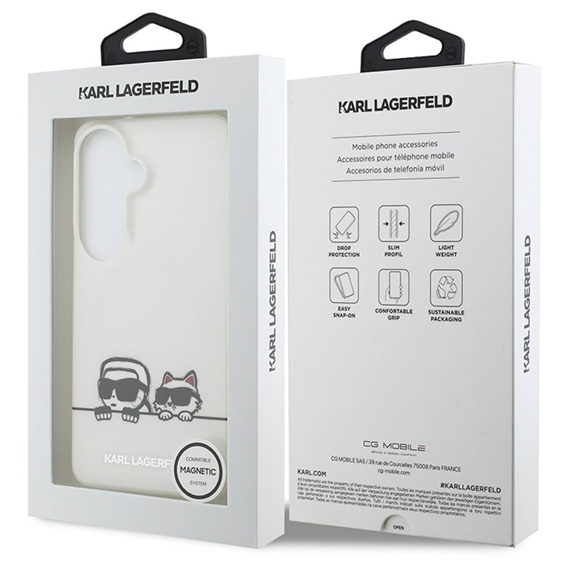 Make a bold fashion statement with the Karl Lagerfeld IML Karl and Choupette Peekaboo Logo magnetic case for Samsung Galaxy S26+. This premium hybrid back cover blends iconic designer style with everyday practicality. Featuring the Peekaboo logo motif of Karl Lagerfeld and his cat Choupette, it transforms your phone into a stylish accessory while providing reliable protection in a slim, lightweight form.