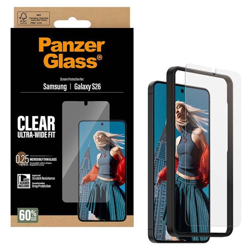 - Ultra-Wide Fit tempered glass screen protector for Samsung Galaxy S26 by PanzerGlass