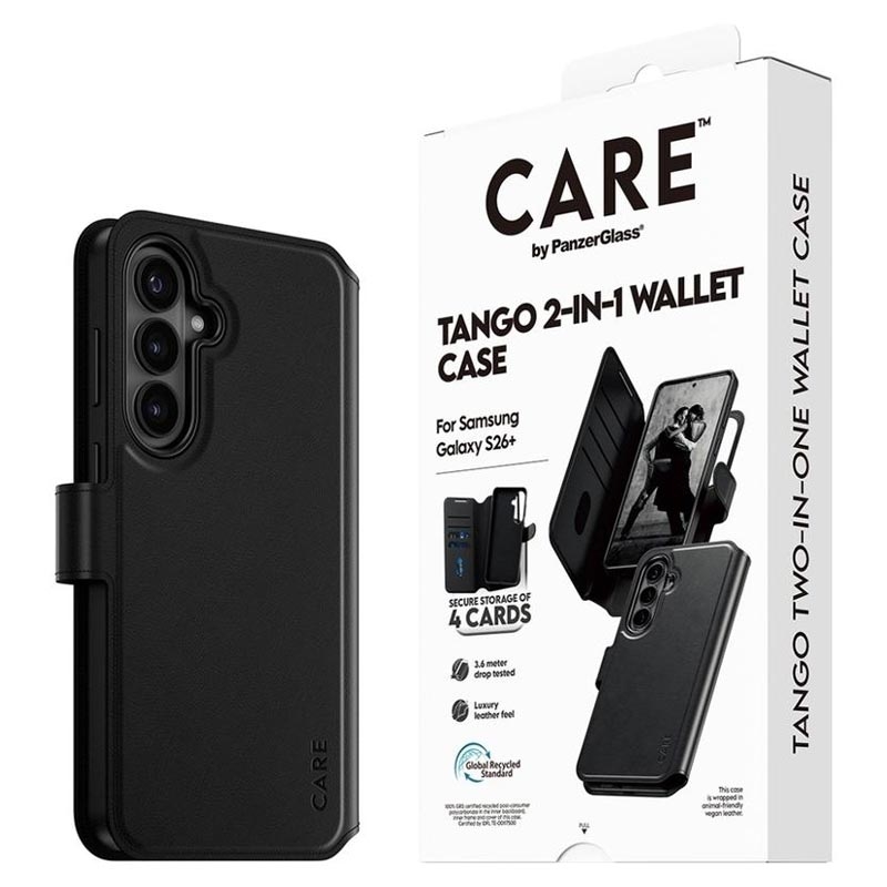 Elevate your Samsung Galaxy S26+ experience with the CARE by PanzerGlass Tango Two-in-One Wallet. This innovative accessory seamlessly combines a luxurious wallet and a protective phone case, offering both style and functionality.