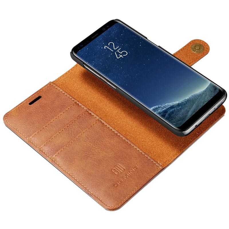 DG.Ming 2-in-1 wallet leather case for Samsung Galaxy S8+ is an excellent combination of a leather folio and a detachable magnetic cover. This case is multi-functional, with card slots and a pocket for money, it keeps everything in place. Metal snap-on closure adds extra security and makes it possible to use the case as a stand for hands-free media viewing. Its excellent design, coated with split leather, feels great in the hand.