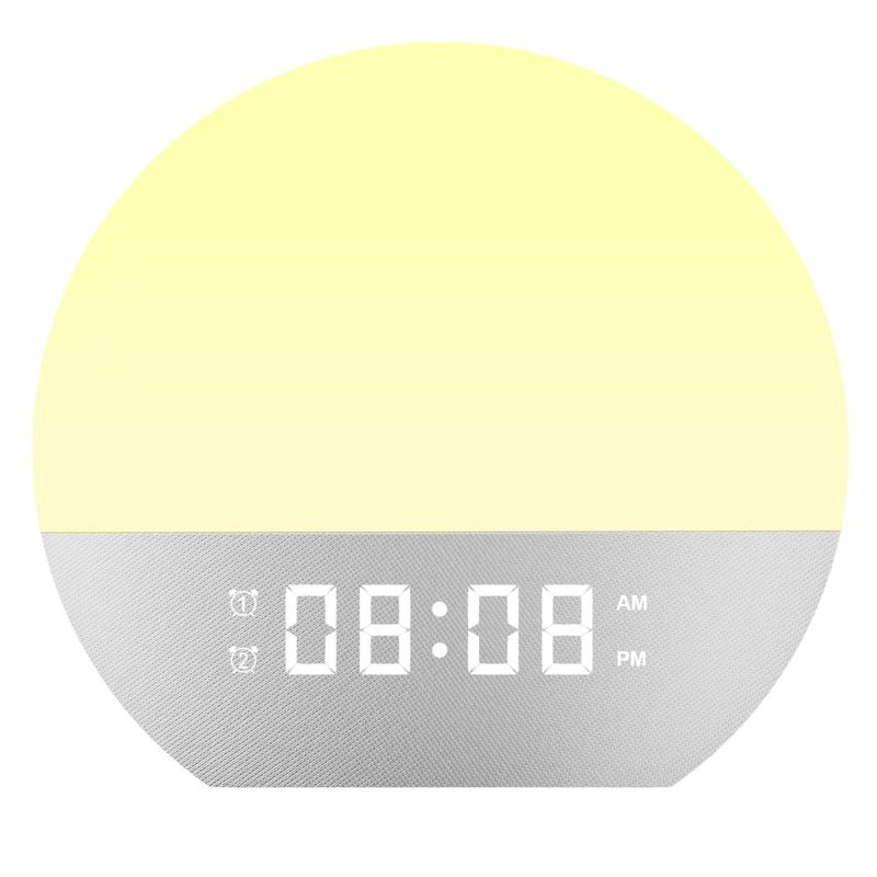 Wake up more naturally and fall asleep more peacefully with the SH08 Bedside LED Wake-Up Alarm Clock Light. This multifunctional bedside lamp combines a sunrise alarm clock, ambient night light, white noise machine, sleep aid, and FM radio in one compact device. It is designed to make both mornings and evenings feel more comfortable, whether you want a gentler wake-up routine, a calmer bedtime atmosphere, or soft ambient lighting for your bedroom.
