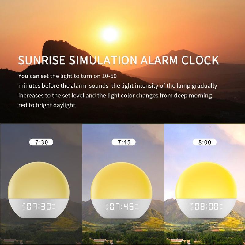 - Sunrise wake-up light that gradually increases brightness for a gentler start to the day