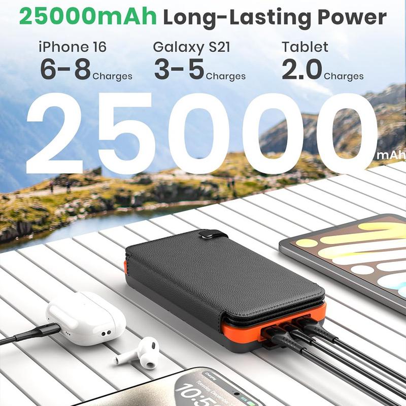 Stay powered anywhere with this 25000mAh solar power bank designed for travel, camping, and emergency backup. With a large-capacity lithium battery and four foldable solar panels, it provides reliable power for smartphones, tablets, cameras, and other USB devices even when you are away from a wall socket. The compact folding design protects the panels and makes it easy to carry in a backpack, while the included carabiner allows you to attach it to your gear for solar charging during hikes or trips.