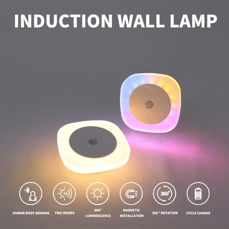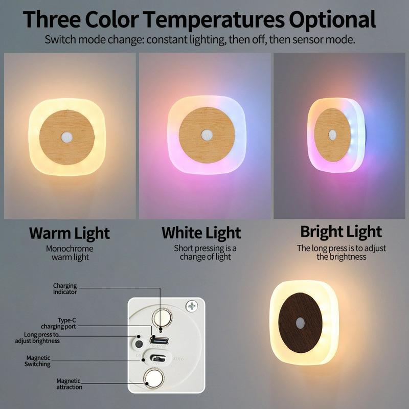 Square Motion Sensor LED Night Light - Magnetic Rechargeable Wall Lamp with 3 Color Temperatures, 360 Rotating Ambient Light