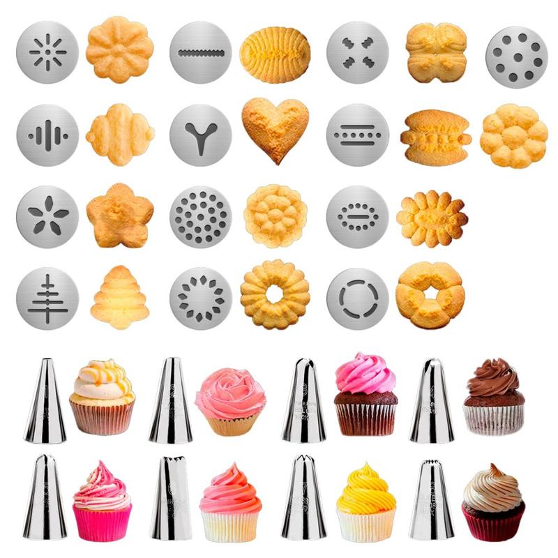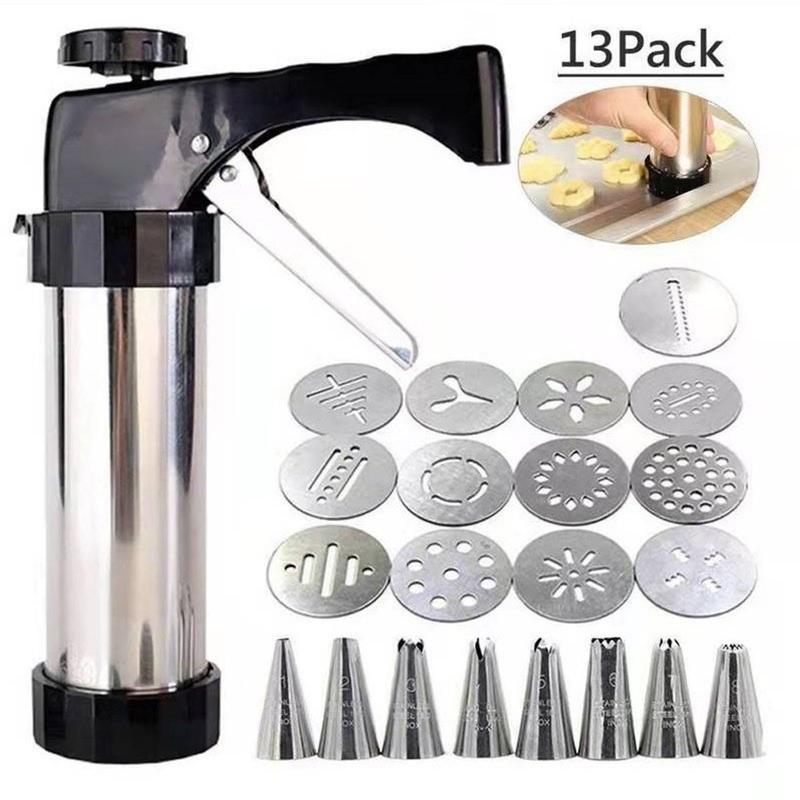 - Complete baking set with 1 cookie press gun, 13 cookie discs, and 8 piping nozzles