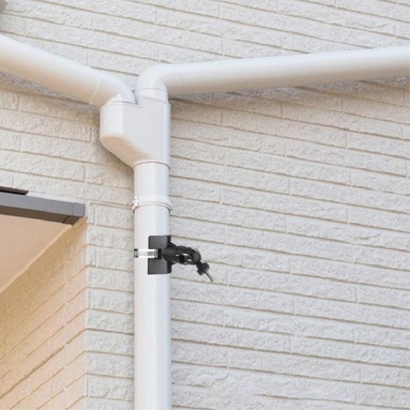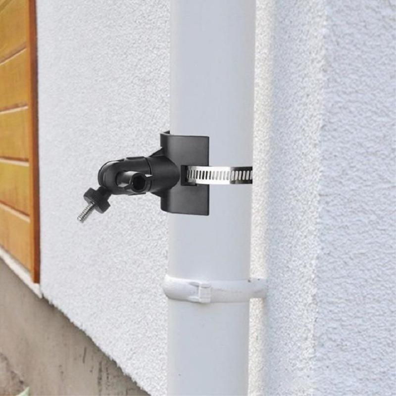 The clamp design allows mounting on drain pipes, railings, poles, tree trunks and other cylindrical objects, offering flexible installation options for homes, gardens, warehouses and outdoor areas.