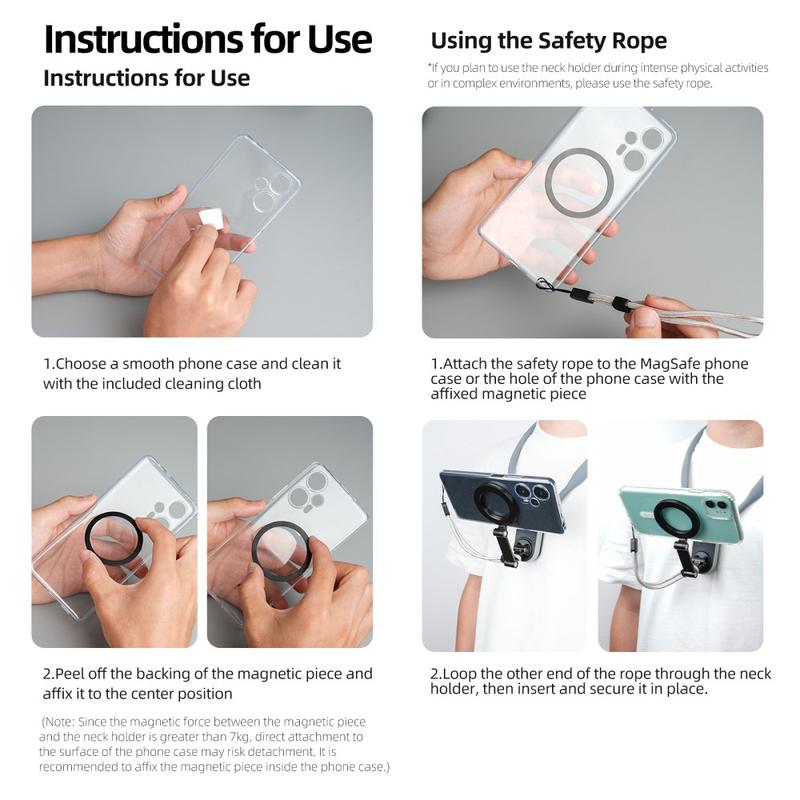 3. The use of safety ropes requires a phone case; One end of the safety rope is tied to the hole in the phone case; Place the other end on the hanging neck, lock the hanging neck, and pull the adjustment buckle of the safety rope to the minimum