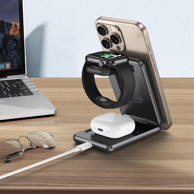 Totu CW-4-W 3-in-1 Wireless Charging Station - Magnetic Folding Charger Stand for Phone, Watch & Earbuds - 15W Fast Charge