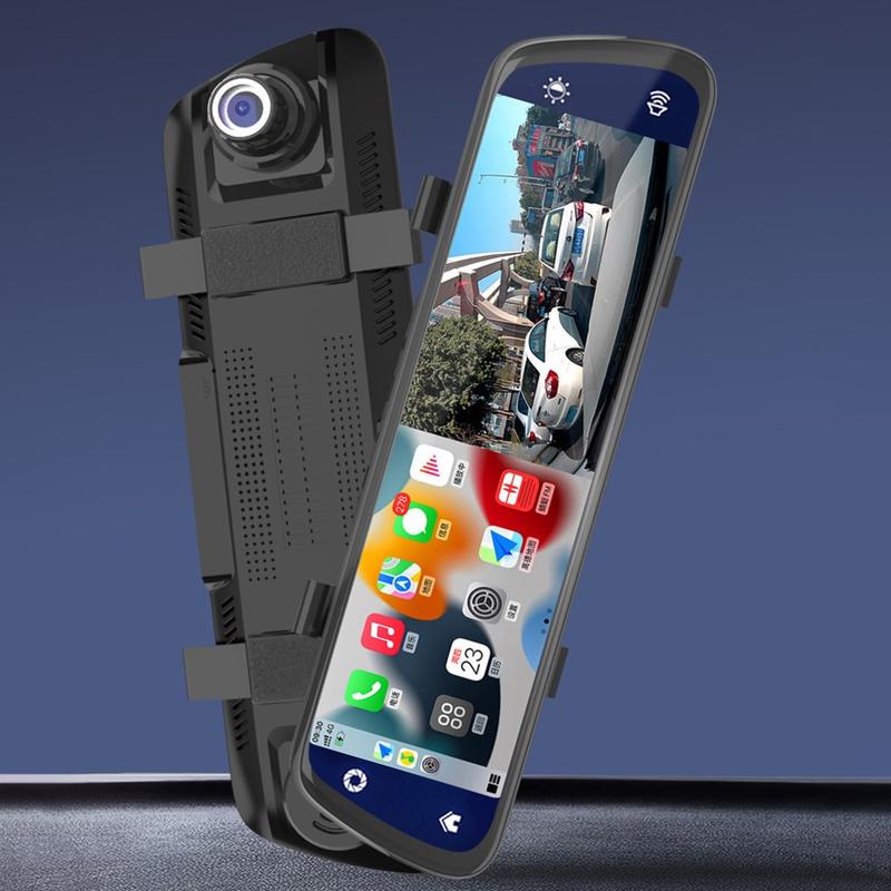904 9.66" Touchscreen Dash Cam with CarPlay - Full-Screen Streaming Rearview Mirror 4K and 1080P Dual Lens DVR