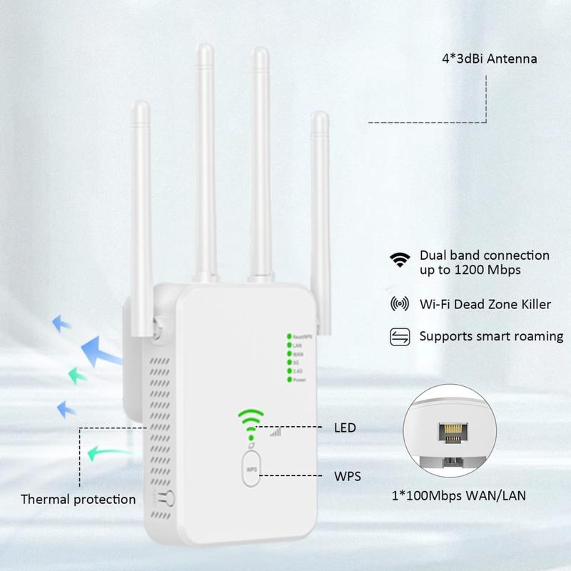 - Dual-band WiFi extender and router with up to 1200 Mbps speed