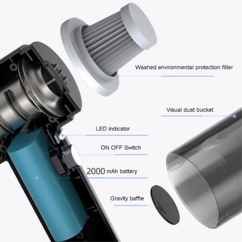 The 6000Pa cordless car vacuum cleaner is a powerful, portable cleaning tool designed to keep your car, home, and office spotless. With 120W high-performance suction and a 6000Pa vacuum pressure, it effectively removes dust, crumbs, pet hair, soot, and even small water stains. The included multifunctional brush heads reach into tight gaps, car seats, floor mats, and luggage compartments for a thorough clean. Lightweight and cordless, it delivers up to 30 minutes of continuous use on a full charge, powered by a 2000mAh rechargeable battery. The large 0.5L dust cup means less frequent emptying, while USB charging provides convenient power from adapters, power banks, or car chargers.