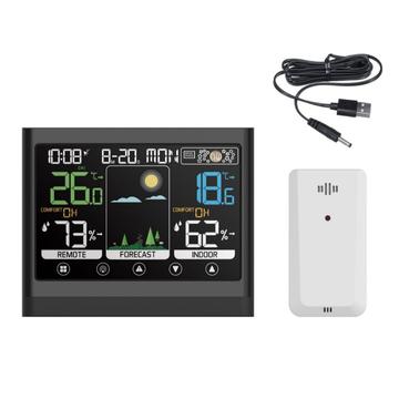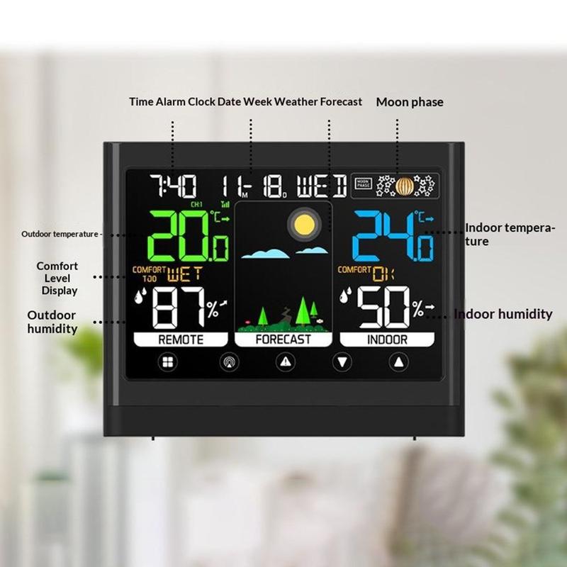This color touch screen weather station combines time, weather forecasting, temperature monitoring, humidity tracking, and alarm functions in one practical desktop device. Designed for daily use at home or in the office, it helps you check indoor and outdoor conditions at a glance while keeping important everyday information clearly visible. Its large colour display and touch controls make it a useful addition to a bedside table, desk, kitchen, or living space.