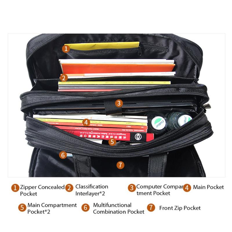 - Internal Structure: Front pocket, functional combination pocket, main pocket, laptop compartment, classification pocket, document compartment and more