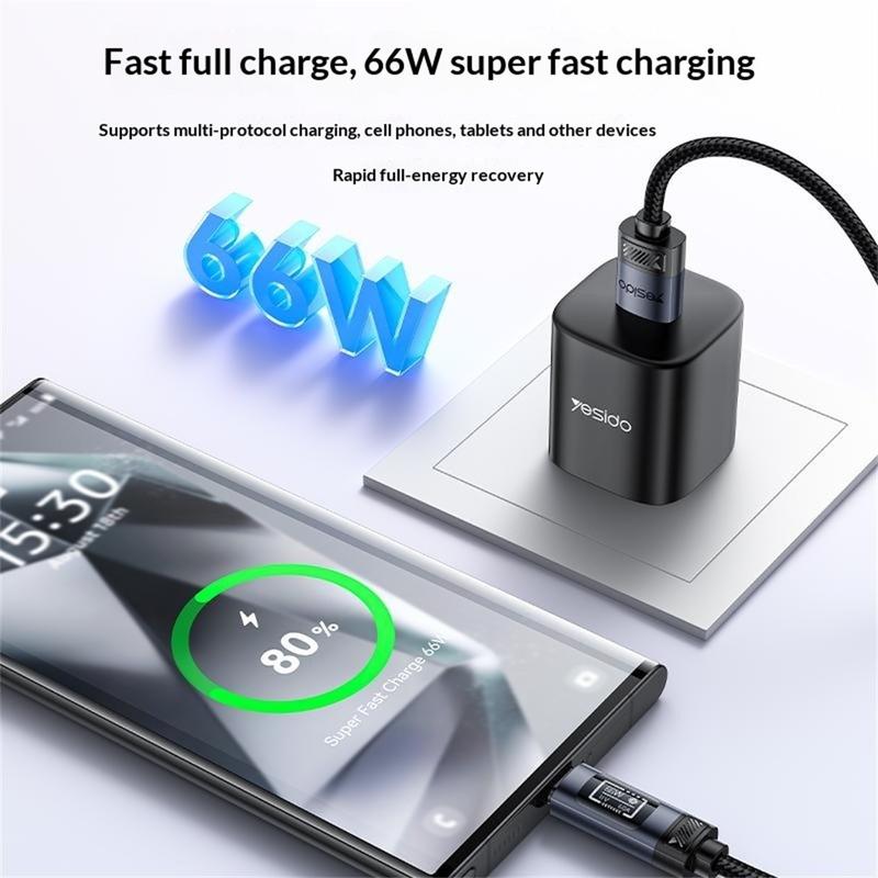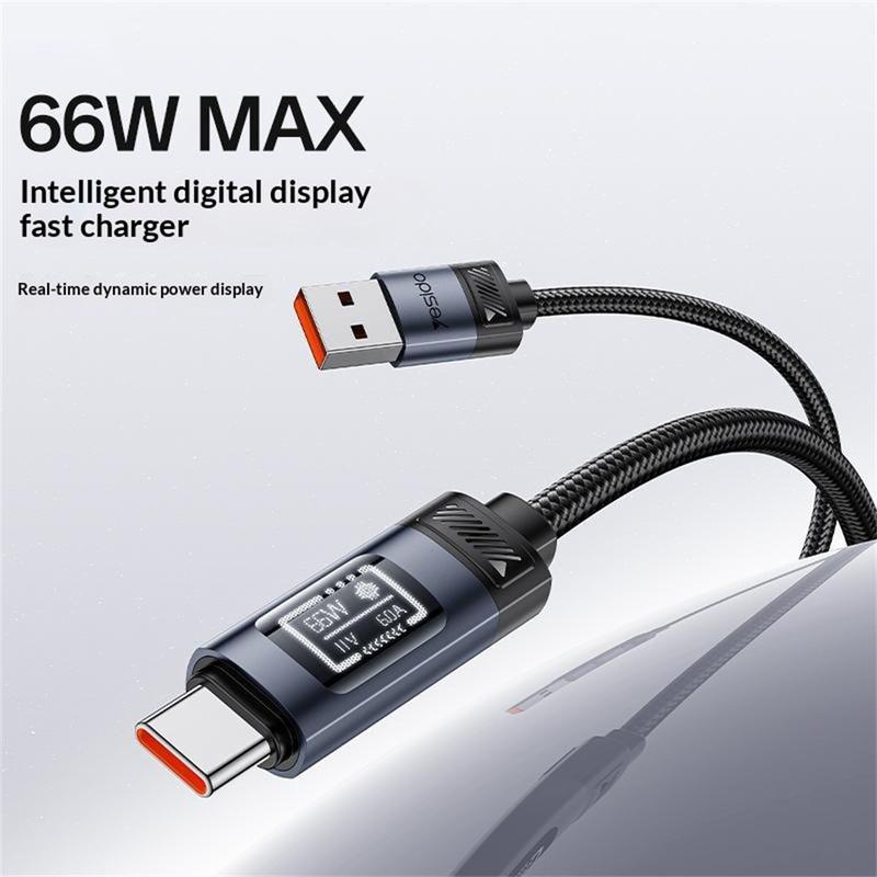 Charge your devices faster while monitoring real-time power delivery with the YESIDO CA138C fast charging cable. Designed for high-performance charging, this USB-A to USB-C cable supports up to 66W output and features a built-in OLED digital display that shows voltage, current, and power during charging. This allows you to easily monitor charging performance and ensure stable power delivery to your device.
