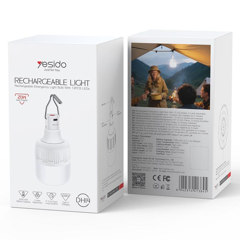 Yesido DH14 Rechargeable Emergency LED Light Bulb - 12-LED Camping Lantern with 3 Brightness Modes, 2400mAh Battery, USB-C Charging