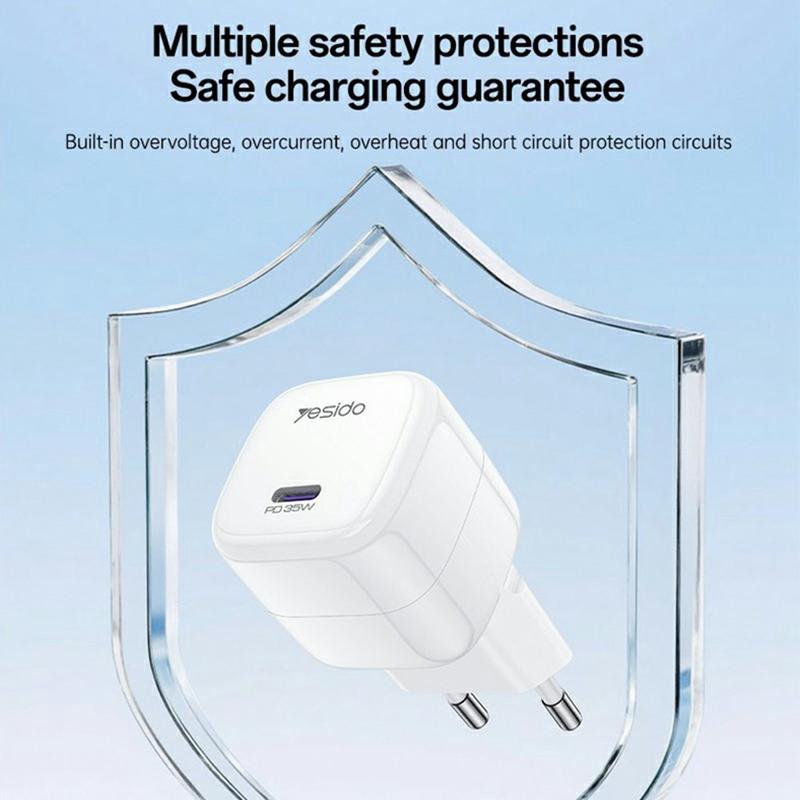 Charge faster with less bulk using the YESIDO YC103 PD 35W GaN wall charger. This compact USB-C power adapter is built for modern phones, tablets, and everyday devices that support Power Delivery. With up to 35W output, it intelligently adjusts power to your device for efficient charging, while GaN technology helps improve energy efficiency and heat management—great for daily use and travel. The mini stacked design fits easily into pockets and small bags, and the wide AC 100-240V input makes it a reliable companion for trips. Multiple safety protections and smart detection help protect both your devices and the charger, including a gentle low-power charging phase for safer overnight charging.