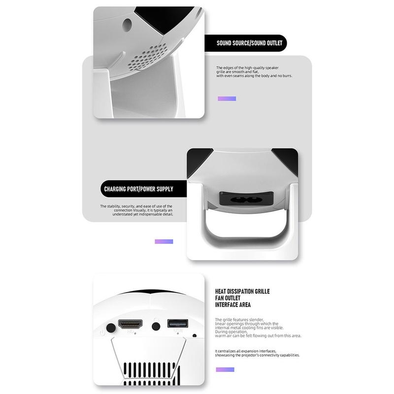 Its lightweight and portable design makes setup quick and flexible—perfect for living rooms, children’s rooms, camping trips, or backyard gatherings. Despite its compact size, the YT600 delivers a clear, enjoyable viewing experience with low noise operation and built-in speakers.