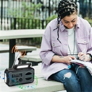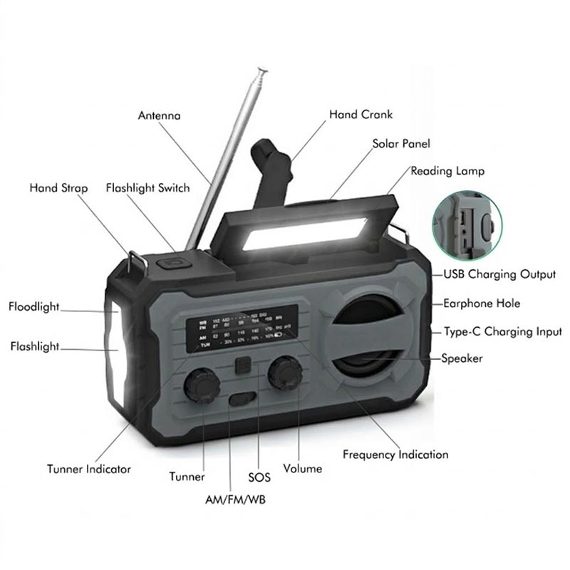 The integrated weather band radio allows you to receive emergency alerts and updates, while the bright 3W LED flashlight provides reliable lighting. A separate 180 rotatable reading light makes it convenient for reading, repairs, or working in low light. When sunlight is available, the solar panel helps recharge the internal battery, and the built-in hand crank provides backup power generation when needed.