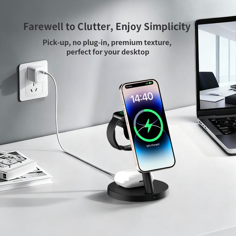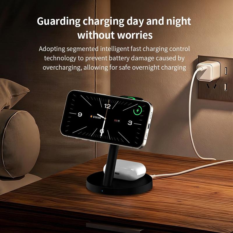 3-in-1 wireless chargers are popular because they reduce cable clutter and make daily charging more convenient. Magnetic charging stands are especially useful because they help guide the phone into the correct position more easily than a flat charging pad. Models with adjustable holders also make it easier to check notifications, use standby mode or keep the screen visible while charging.
